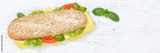 Sandwich Baguette Vollkorn Brötchen belegt mit Käse von oben Banner auf Holzbrett