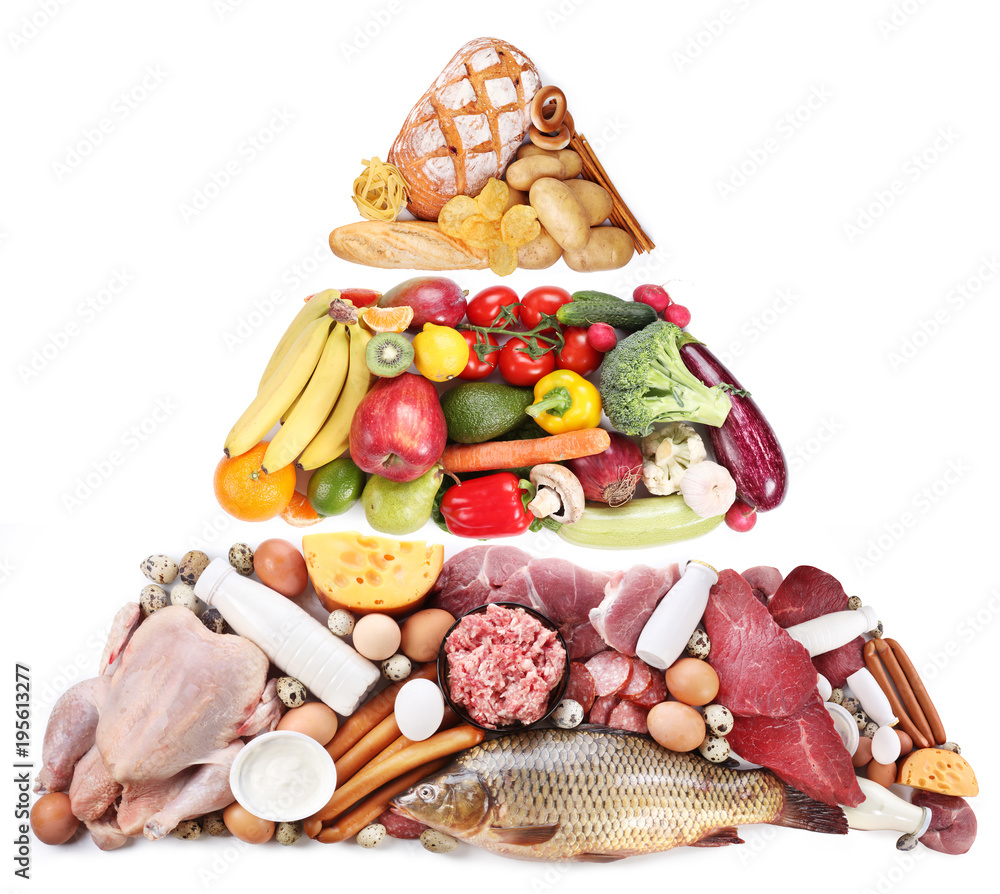Food pyramid or diet pyramid presents basic food groups.