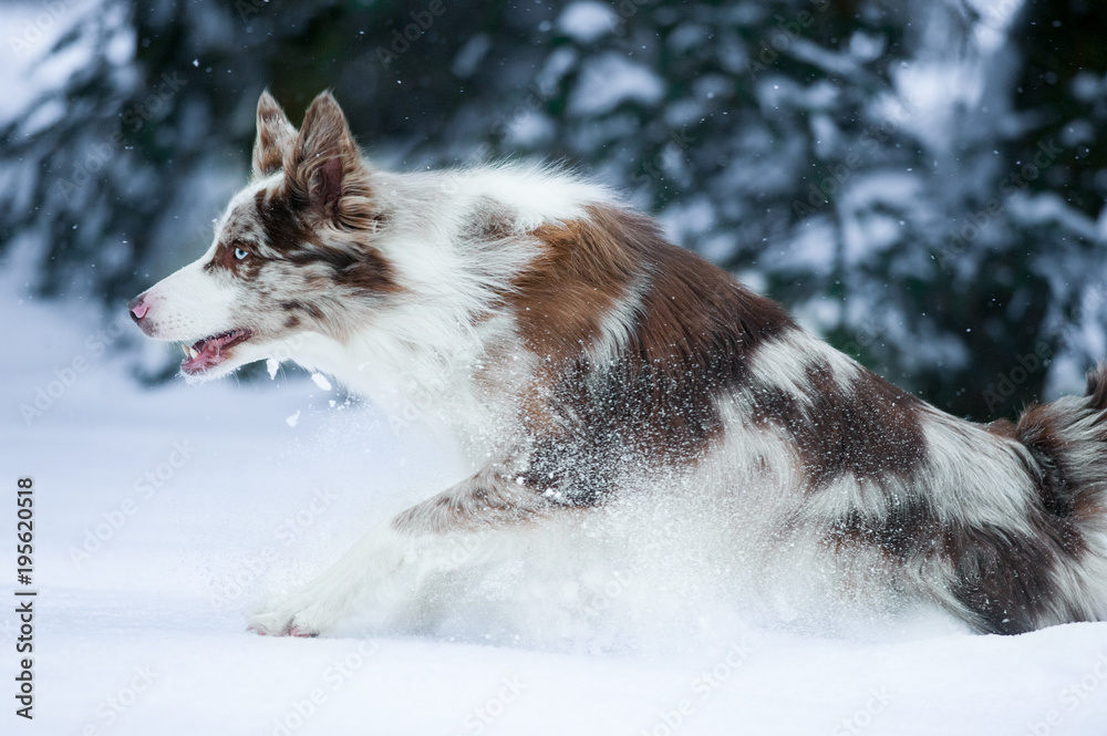 border collie runs in winter closeup