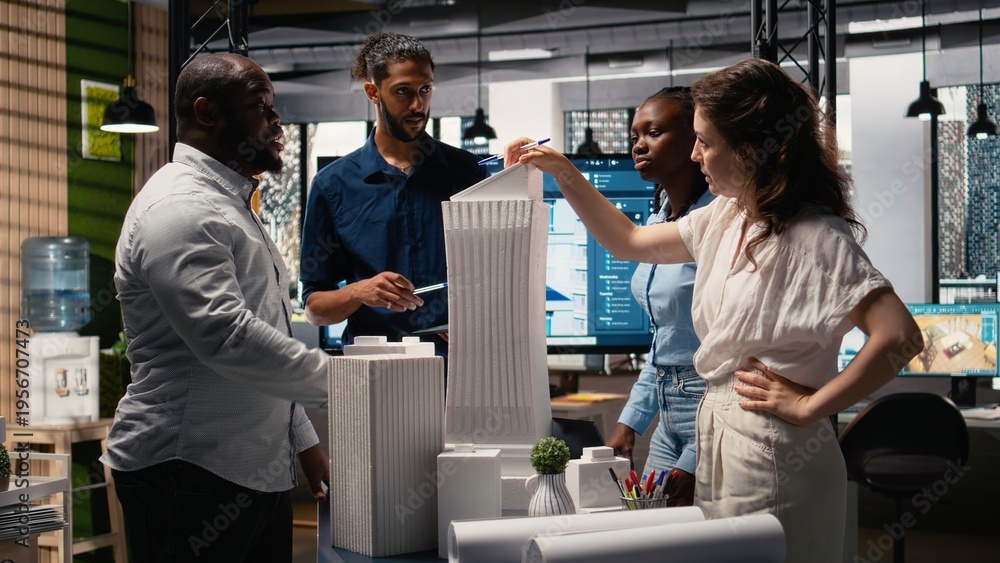Diverse team of developers sharing construction details in a briefing session, urban development vision using advanced architectural software and 3D models for a modern housing project.