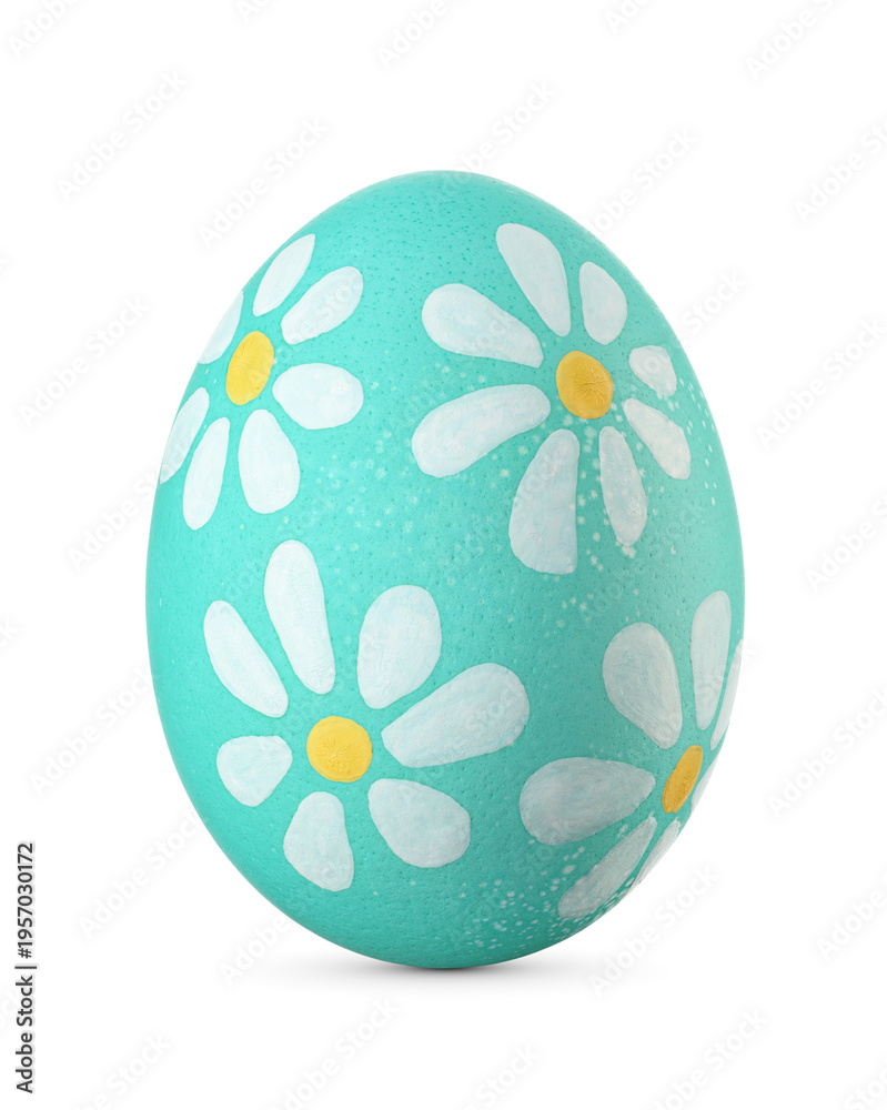 Turquoise Easter egg with chamomile flowers isolated. Handmade painted decoration. Transparent PNG image.