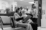 Asian gerontology physician in charge of gerontology area requesting personal data from elderly patient. Medical clinic receptionist personnel attending african american sick young couple of people.