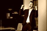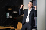 Happy male executive raising hands and celebrating win