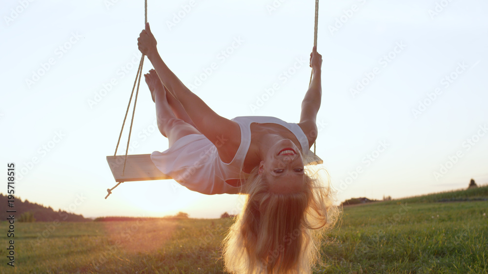 LENS FLARE, CLOSE UP: Attractive young woman leans back on swing while swaying.