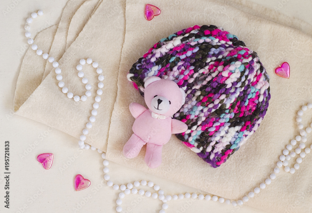 Children's hooked hat handmade. Accessories and details for the newborn photo shoot. Pink glass hearts, white coral and pink cute teddy as a decor