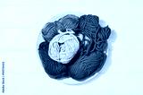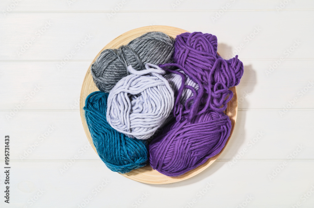 Top view of colorful knitting yarn balls and needlework accessories on white wooden textured table background. Photograph taken from above with copy space around products