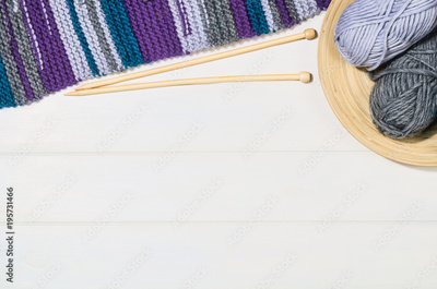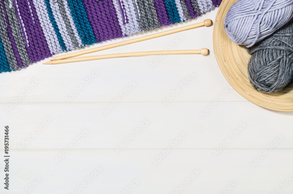 Top view of colorful knitting yarn balls and needlework accessories on white wooden textured table background. Photograph taken from above with copy space around products