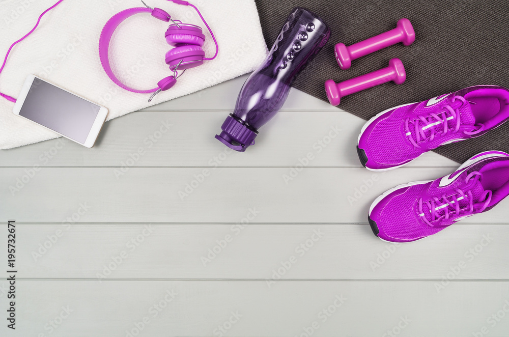 Sport and fitness accessories, healthy and active lifestyle concept on wooden floor background with copy space. Products with vibrant, punchy pastel colours. Image taken from above, top view.