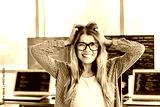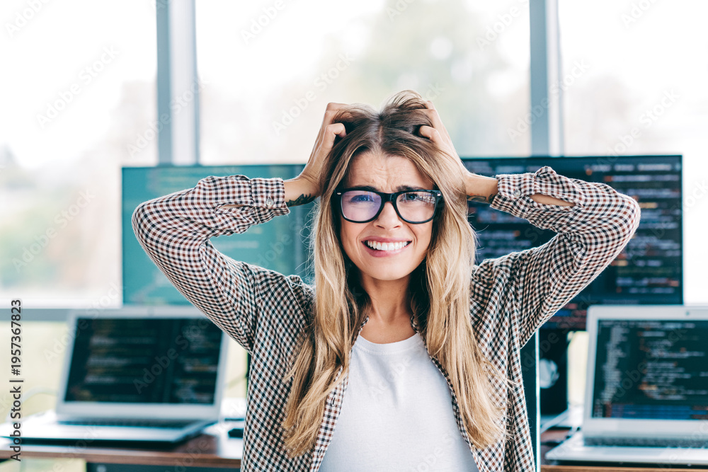 Frustrated female programmer pulling her hair in a modern office surrounded by laptops and code-filled monitors, stressed developer facing bug and deadline pressure