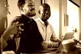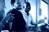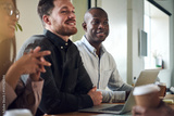 Diverse businesspeople smiling while sitting together in a boardroom