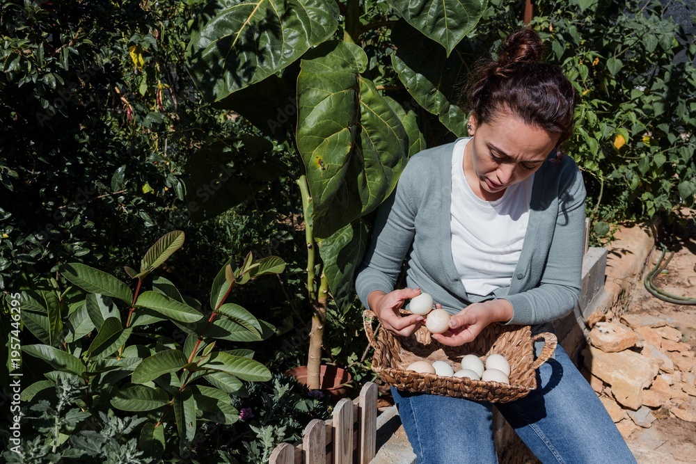 woman farmer collecting eggs on the organic farm with chickens or laying hens