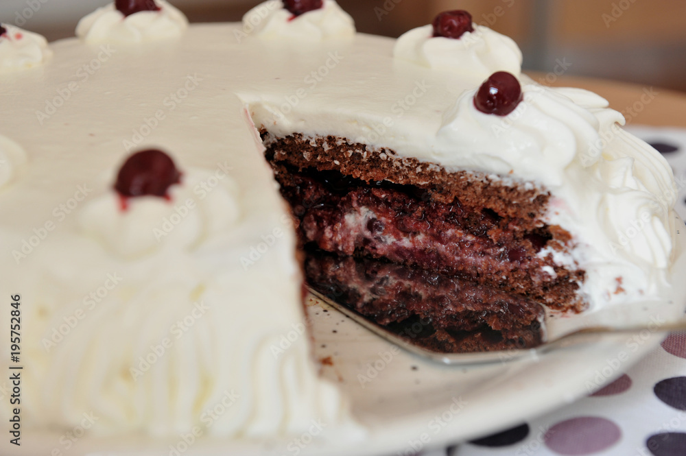 Sour cherry cake with whipped cream - piece of cake close-up.