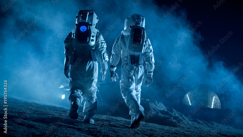 Shot of Two Astronauts in Space Suits on Alien Planet Walking Toward Rover and Geodesic Dome. High-Tech Space Exploration Concept. Manned Mission Searching and Discovering New Habitable Planets.