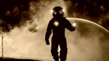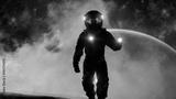 Courageous Astronaut in the Space Suit Holds Flashlight and Explores Mysterious Alien Planet Covered in Mist. Other Planet in Background. Adventure. Space Travel and Colonization Concept.