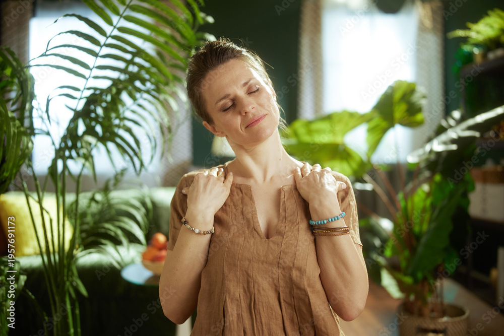 A peaceful woman stretches her neck with hands on her shoulders, focusing on self-care and wellness in a bright, plant-filled indoor environment.