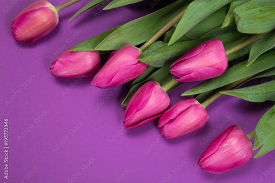 spring pink tulips on a lilac paper background