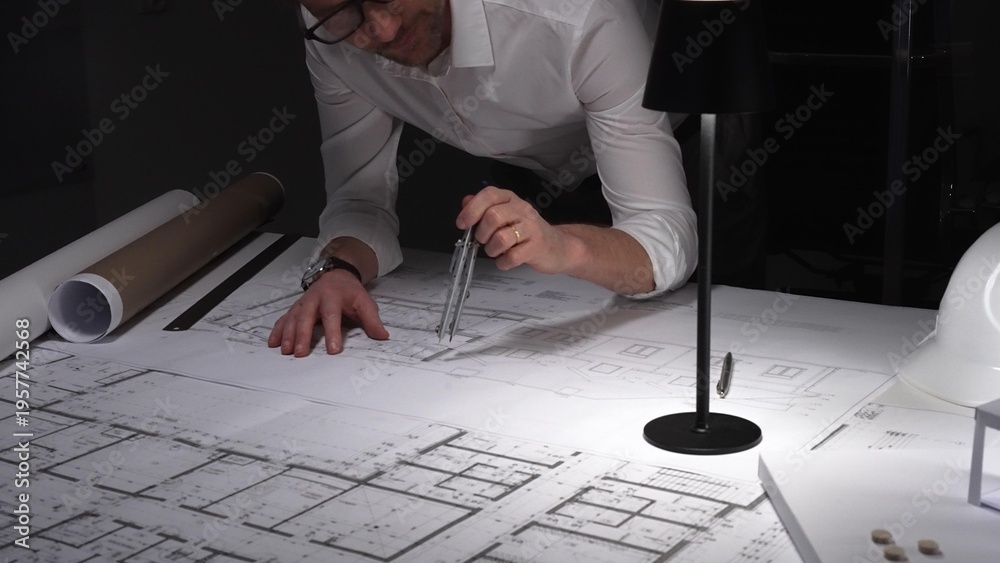 Architect drawing and measuring blueprints with a compass, focusing on detailed architectural plans under a desk lamp.