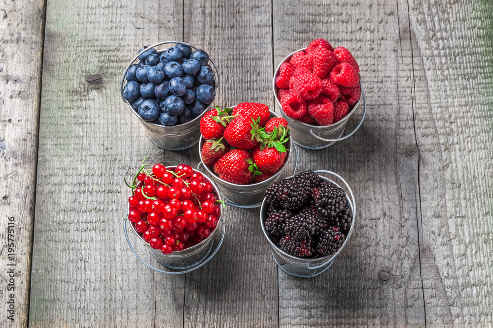 Berries colorful arrangement mix overhead in tin cans on wooden table in studio