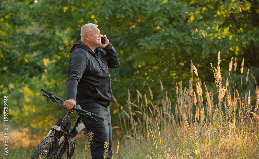 A gray-haired elderly man spends time on a bicycle ride and uses a smartphone
