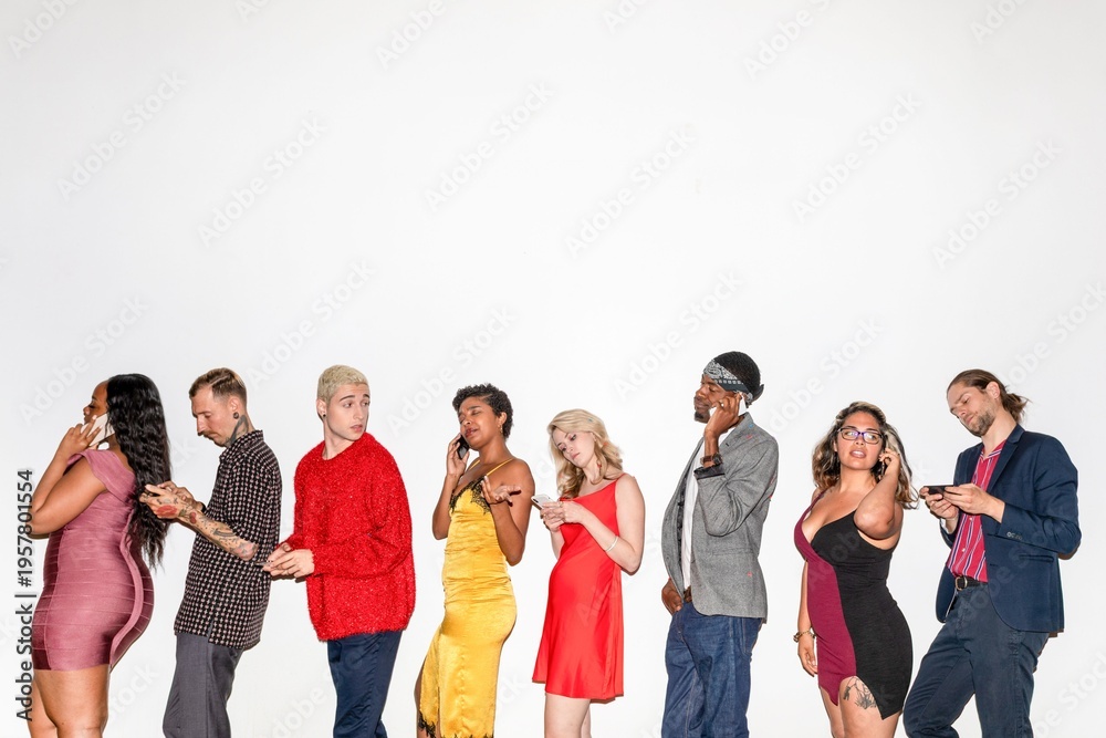 Diverse group stylish partygoers waiting.