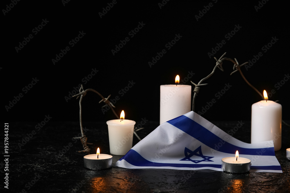 Burning candles, barbed wire and flag of Israel on dark background. Holocaust Remembrance Day