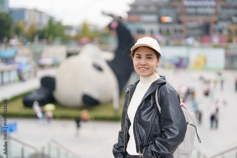Happy woman traveler travel in Dujiangyan city. Tourist sightseeing Yangtianwo Square and Guanxian Ancient City near Chengdu. Landmark and popular for tourism attraction in Sichuan, China
