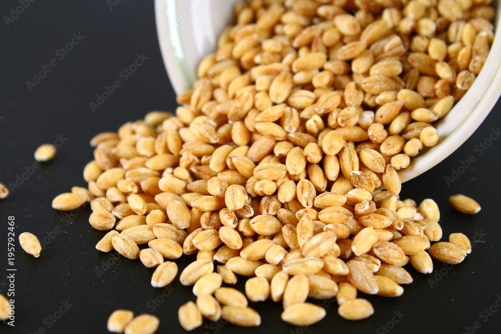Dry pearl barley in a wooden bowl on a black chalkboard.