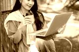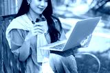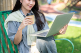 Pretty asian woman holding coffee cup and looking at a laptop while sitting on bench in garden park.