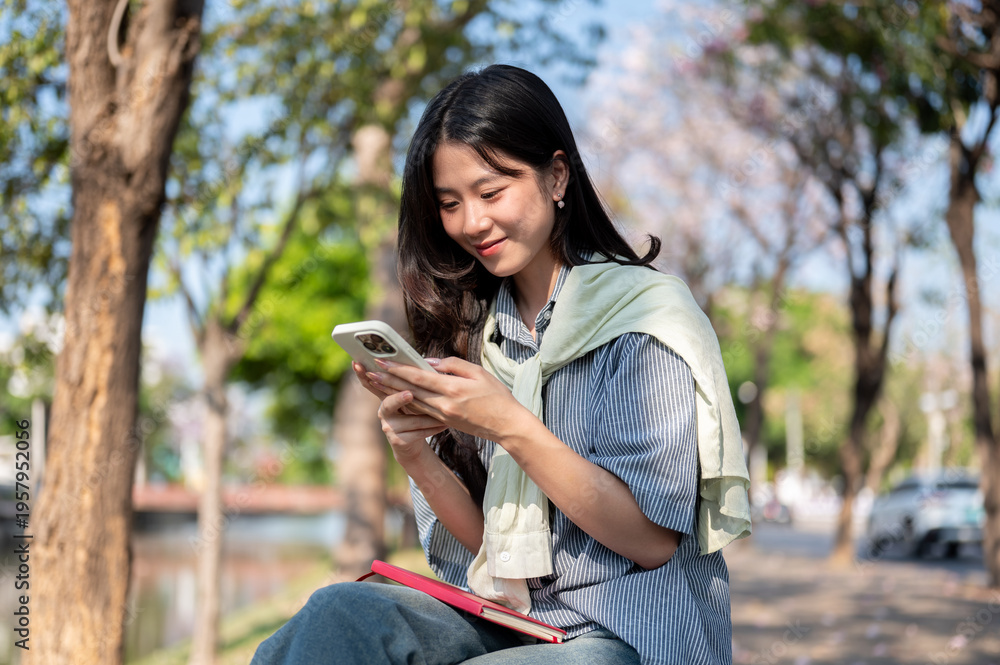 Happy asian woman using or looking at phone over book while sitting on bench at sidewalk by the road