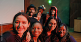 Indian young adult gen z male man female look camera take selfie photos have fun joy hall stage place. Happy teen girl boy group team staring cam do funny pose record video spend day enjoy break time