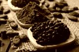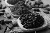 Coffee beans, cacao powder, cocoa nibs, on wooden plates on burlap