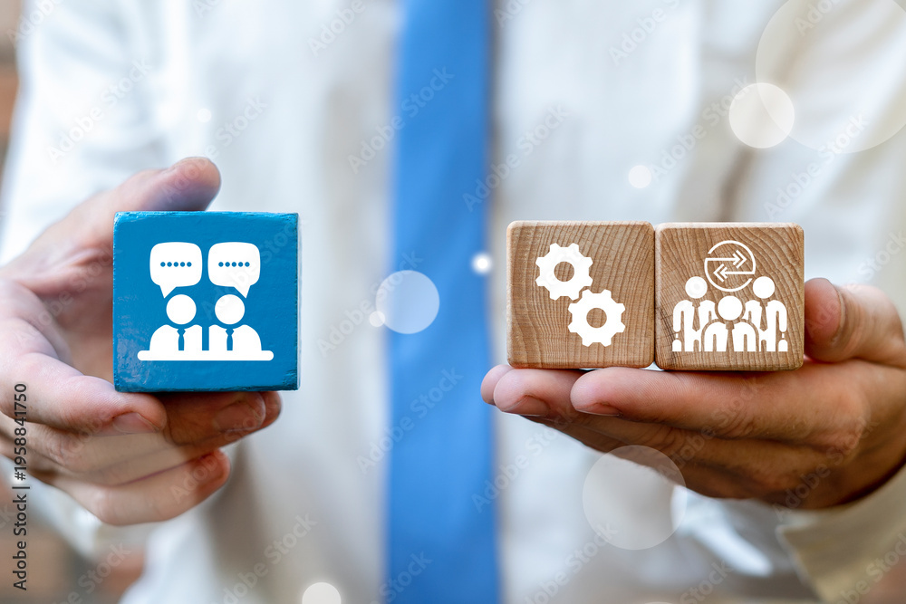 Concept of interpersonal communication skills. Business person holding blocks with icons symbolizing of interpersonal communication skills. Social and business education.