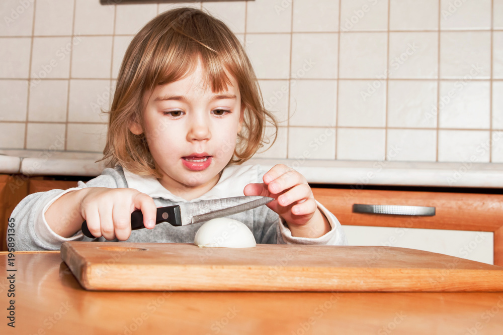 Little baby girl cuts onions on cutting board on kitchen.