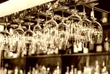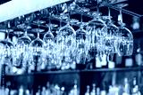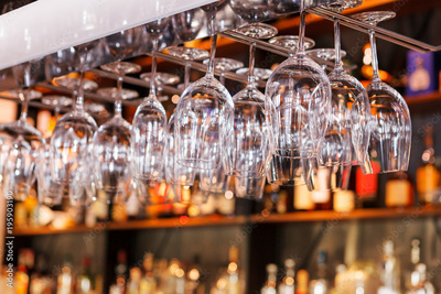 different glasses hanging over the bar. Soft focus. selective focus. close up