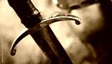 Medieval knight with sword in armor as style Game of Thrones in battle or tournament black and white old photo