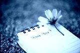 Thank You text on a white page note book with romantic white flower on wooden background.