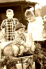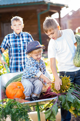 Children in the garden wheelbarrow with fresh vegetables and roots outdoor. The boy is carrying younger brother in the cart.