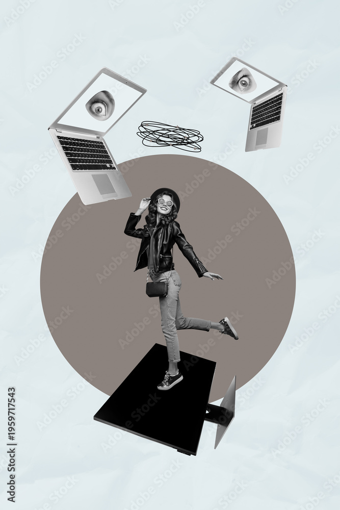 Sketch art 3d creative collage of happy man girl stand pc monitor laptop eyeball cyberattack control eyeball esoteric virus