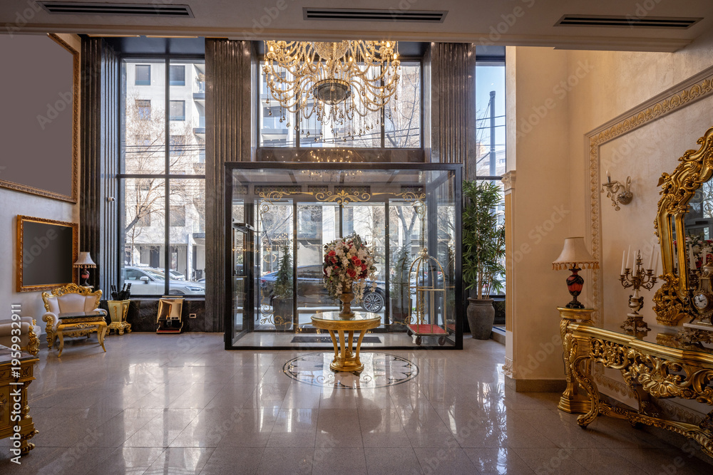Luxury hotel lobby interior with gilded furniture and crystal chandelier in elegant classic style