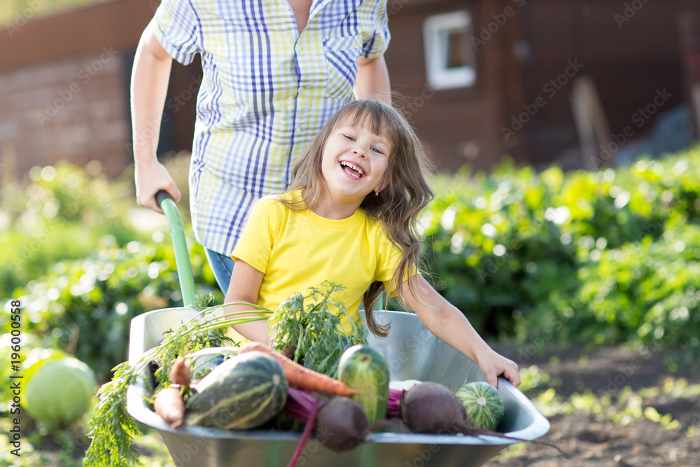 Woman pushing her kid daughter in a wheelbarrow filled healthy vegetables in the garden