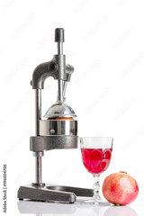 fruit press juicer, glass of pomegranate juice and and fresh pomegranate fruit isolated on white