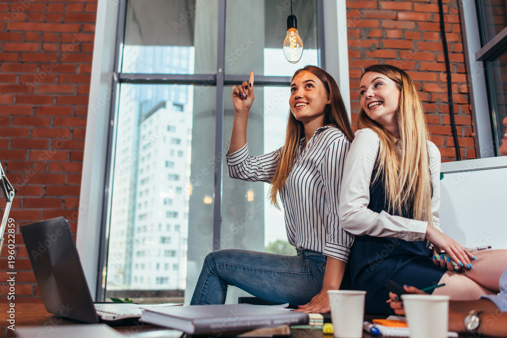 Students sitting together on desk in classroom, a girl pointing at light bulb like having a brilliant idea.