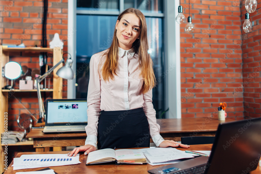 Female manager standing at her workplace planning her working day reading notes made in notebook