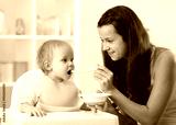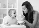 Yong mom giving homogenized food to her baby son on high chair in kitchen.