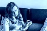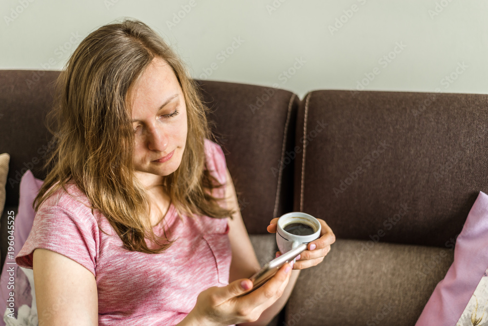 Young woman using mobile phone and coffee, home relax on sofa with smartphone, people's lifestyle concept