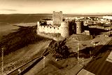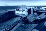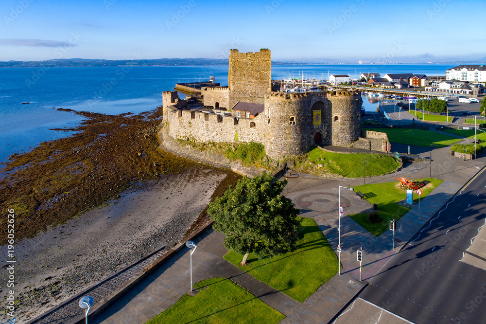 Medieval Norman Castle in Carrickfergus near Belfast in morning light. Aerial view with marina, yachts, parking, town and far view of Belfast in the background.