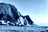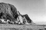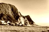 The eastern coast of Northern Ireland with cliffs, hills and houses at Antrim Coastal Road, a.k.a. Causeway Coastal Route.