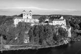 Benedictine abbey on the rocky hill in Tyniec near Cracow, Poland, and Vistula River. Aerial view at sunset