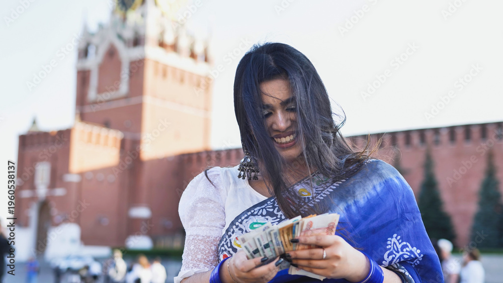 Young Indian woman counting money in Moscow