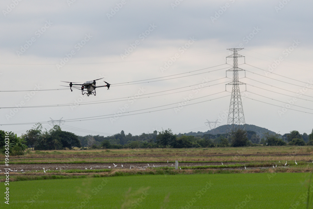 Drone hovers above vibrant rice paddies with distant transmission towers